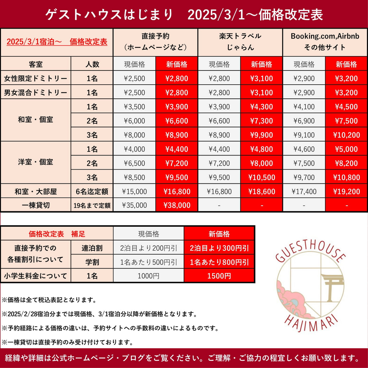 2019年10月の開業以来、初めて価格を改定いたしました。(上記表の通りです。)